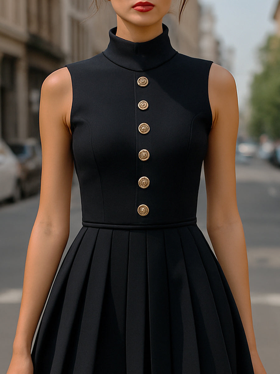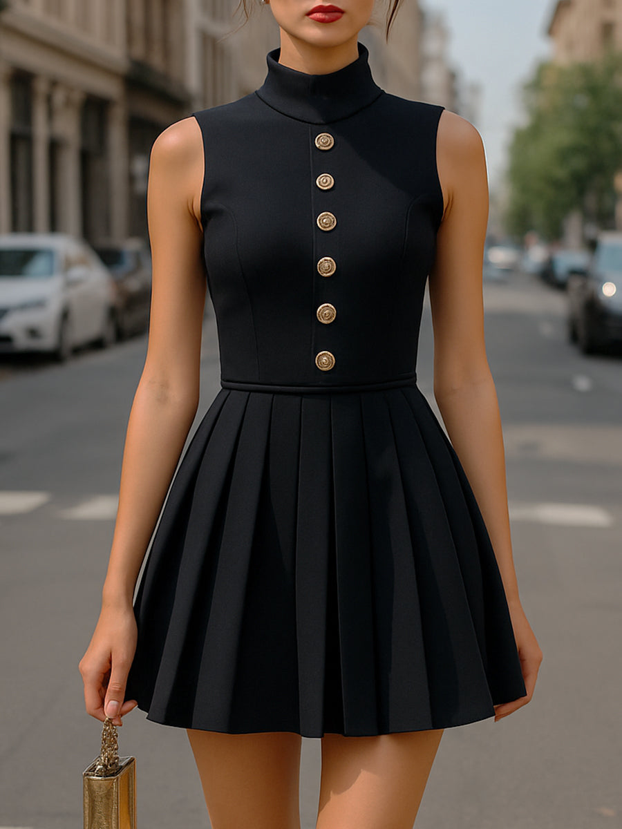Mooyius presents the timeless black mini dress, designed with sophistication and modern charm. The high-neck collar adds an elegant touch, while the sleeveless cut offers a sleek, contemporary silhouette. Featuring a row of vintage-inspired gold buttons down the front and a finely pleated skirt, this dress blends classic military detail with feminine flair. Perfect for evening outings, cocktail events, or chic daywear in the city.