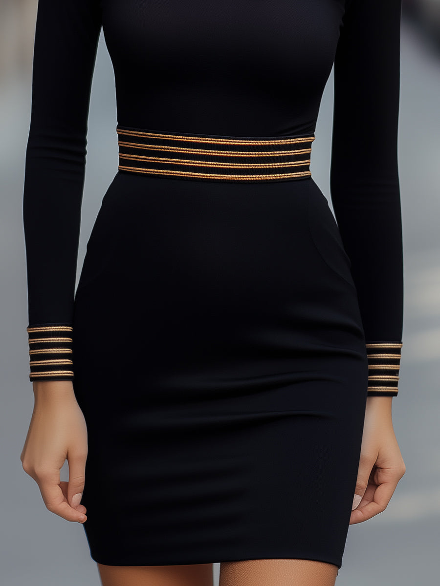 Mooyius presents the Mini Dress with Stripe Detail and High Neck to elevate your sophisticated look. Chic and sporty with a refined edge, this black bodycon mini dress features a high neckline, long sleeves, and gold-accented striped bands at the waist and cuffs.