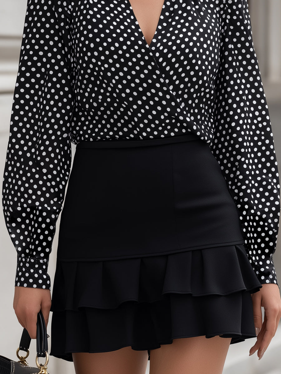 Paired with a sleek high-waisted black mini skirt adorned with double-tiered ruffles, this set delivers effortless elegance and youthful energy—perfect for work-to-weekend transitions.